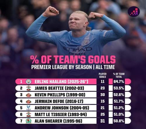 北京时间10月31日,知名数据平台Opta发布数据显示,截至目前,哈兰德本赛季的进球数占曼城全队进球数的64.7%。若在本赛季结束时,他能维持住相当比例,他将打破由詹姆斯-比蒂在2002/03赛季创下的个人进球数占球队总进球数比例纪录。