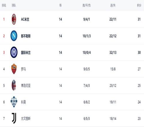 在积分榜上,前2的积分相同。AC米兰总积分31分,以净胜球的优势,登上榜首位置。而同样31分的那不勒斯只能屈居第2。国际米兰以30分排名第3。第4的是罗马,只拿到27分,与榜首有4分的差距。博洛尼亚25分排名第5。第6的是科莫,拿到24分。尤文图斯只拿到23分,排名第7。拉齐奥和亚特兰大的战绩都很差。拉齐奥19分排名第10,而亚特兰大只有16分排名第12。